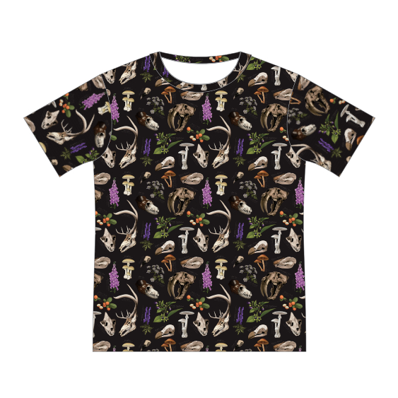 These unisex shirt are made of a soft poly blend with sweat-wicking properties and a lightweight feel. The Decay pattern features various animal skulls in varying stages of decay, poisonous plants, and toxic mushrooms.